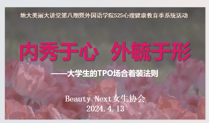 主办、Beauty Next女生协会承办的美丽大讲堂第八期“内秀于心 外毓于形”于4月12日下午15:00,在北一楼报告厅正式开讲。本次活动特邀资深专家——美丽大讲堂第八期特邀嘉宾王萍老师讲授大学生TPO场合着装法则,Beauty Next女生协会及91吃瓜