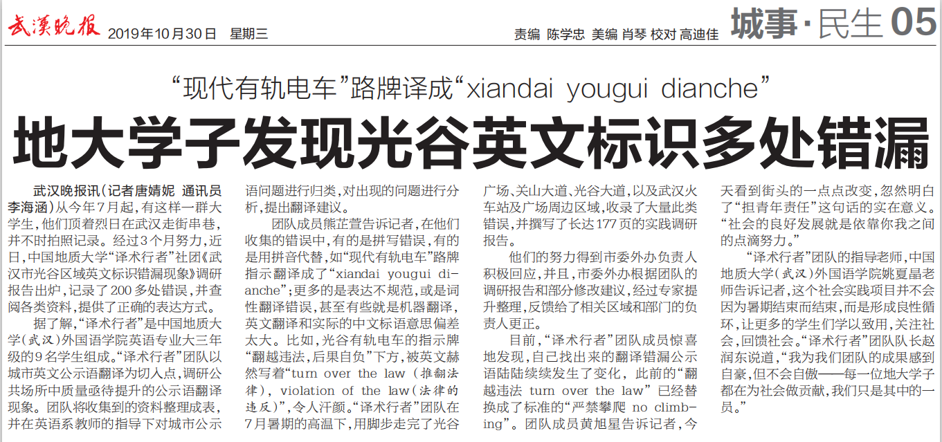 暑期社会实践团队“译术行者”2019年暑期针对武汉城市英文标识的调研,11月1日,武汉电视套四套“经视新看点”栏目对团队成员、指导老师以及学院领导进行了专题采访。